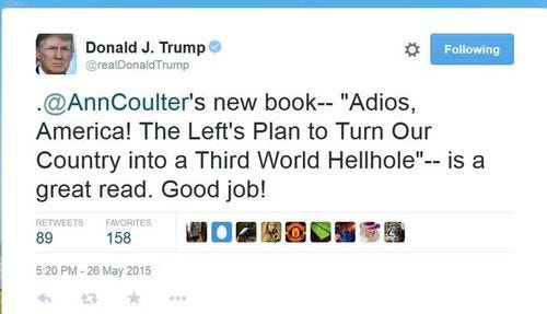 How important was this book? Well, when David Frum wrote about it [America’s Immigration Challenge the Atlantic on December 11, 2015 he said:What seems to have changed Trump’s mind is a book: Adios America by Ann Coulter. The phrase “political book of the year” is a usually an empty compliment, but if the phrase ever described any book, Adios America is it. In its pages, Trump found the message that would convulse the Republican primary and upend the dynastic hopes of former-frontrunner Jeb Bush. Perhaps no single writer has had such immediate impact on a presidential election since Harriet Beecher Stowe.