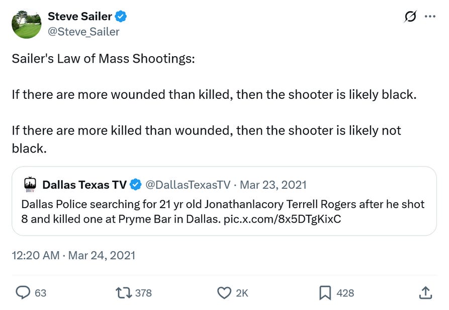 But I want to talk about something else—the fact that there were 14 wounded and only three killed. You may be familiar with Sailer’s Law of Mass Shootings, which is that more wounded than dead means a black (mostly American) mass shooting for frivolous reason, the kind that doesn’t make the news as much as, say, Virginia Tech did, and more dead than wounded means a serious attack by someone willing to die, usually white or Asian.